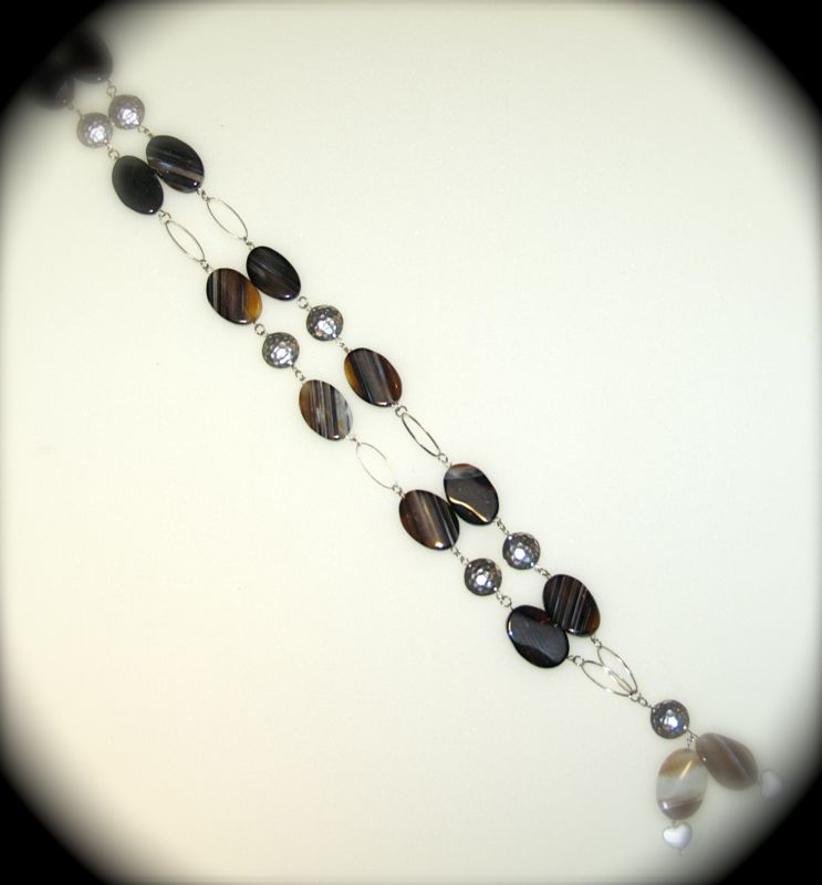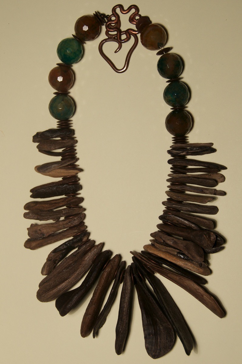 Ultimamente mi sto dedicando alla realizzazione di collane con elementi naturali che trovo in spiaggia (conchiglie levigate e modellate dal mare, rametti di legno anch’essi resi particolari dalla natura, sassi). Durate le passeggiate in spiaggia con le mie piccole (due cucciolotti di Terrier), approfitto per cercare elementi naturali e particolari che poi assemblo con altri elementi quali argentone o pietre dure.