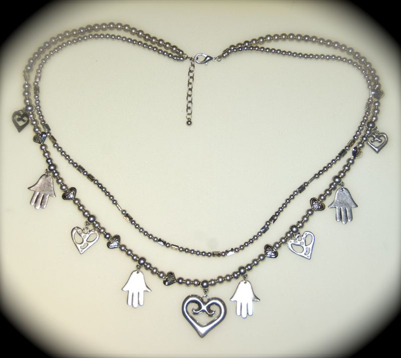 collana cuori e mani [cod. 060] admin Febbraio 1, 2011 Nessun commento COLLANA CUORI E MANI realizzata interamente con elementi in argentone infilati in cavetto di acciaio lunghezza della collana: 88 cm peso della collana: 150 gr